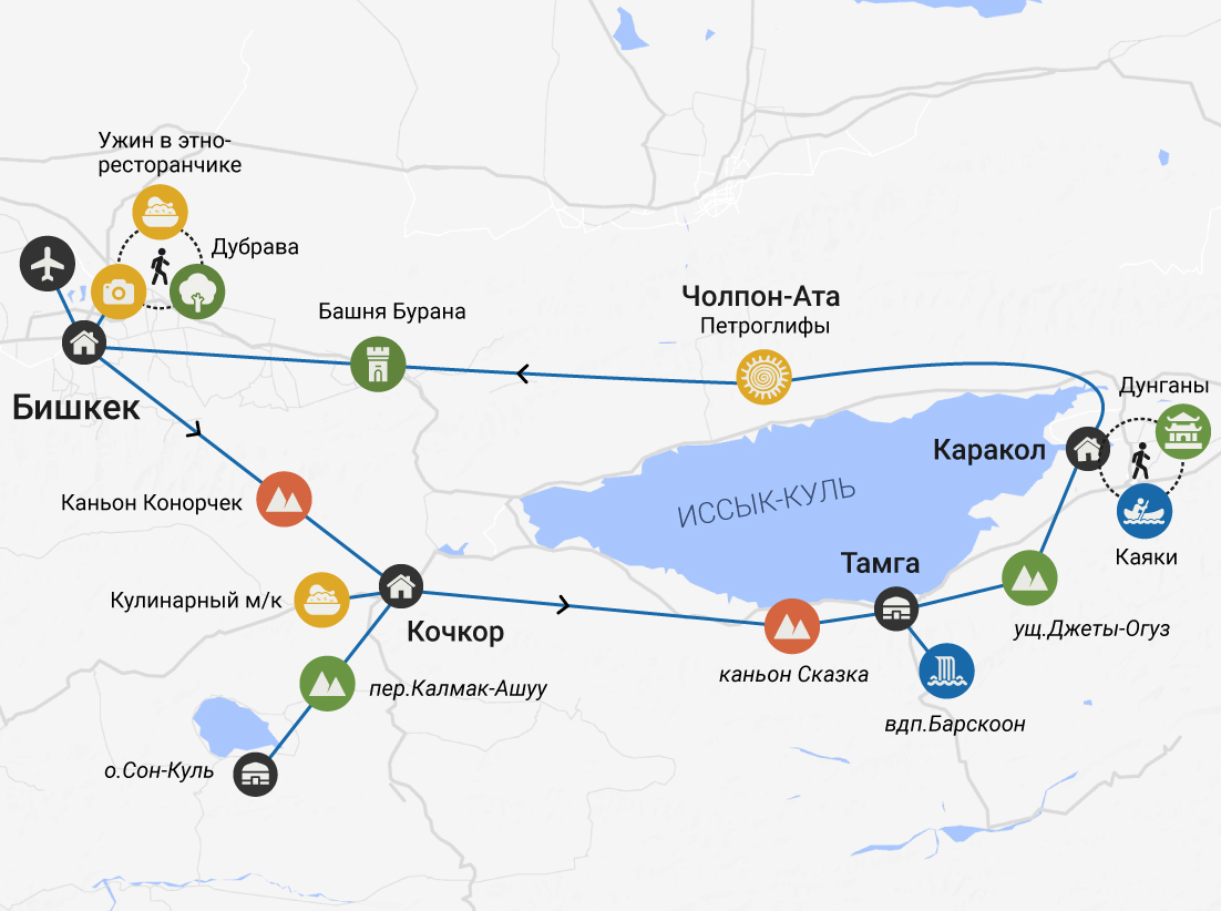 Внимание! Для тех, кто прибывает после 16:00, встреча состоится в 18:30. А обзорная экскурсия по Бишкеку пройдёт утром в последний день тура.