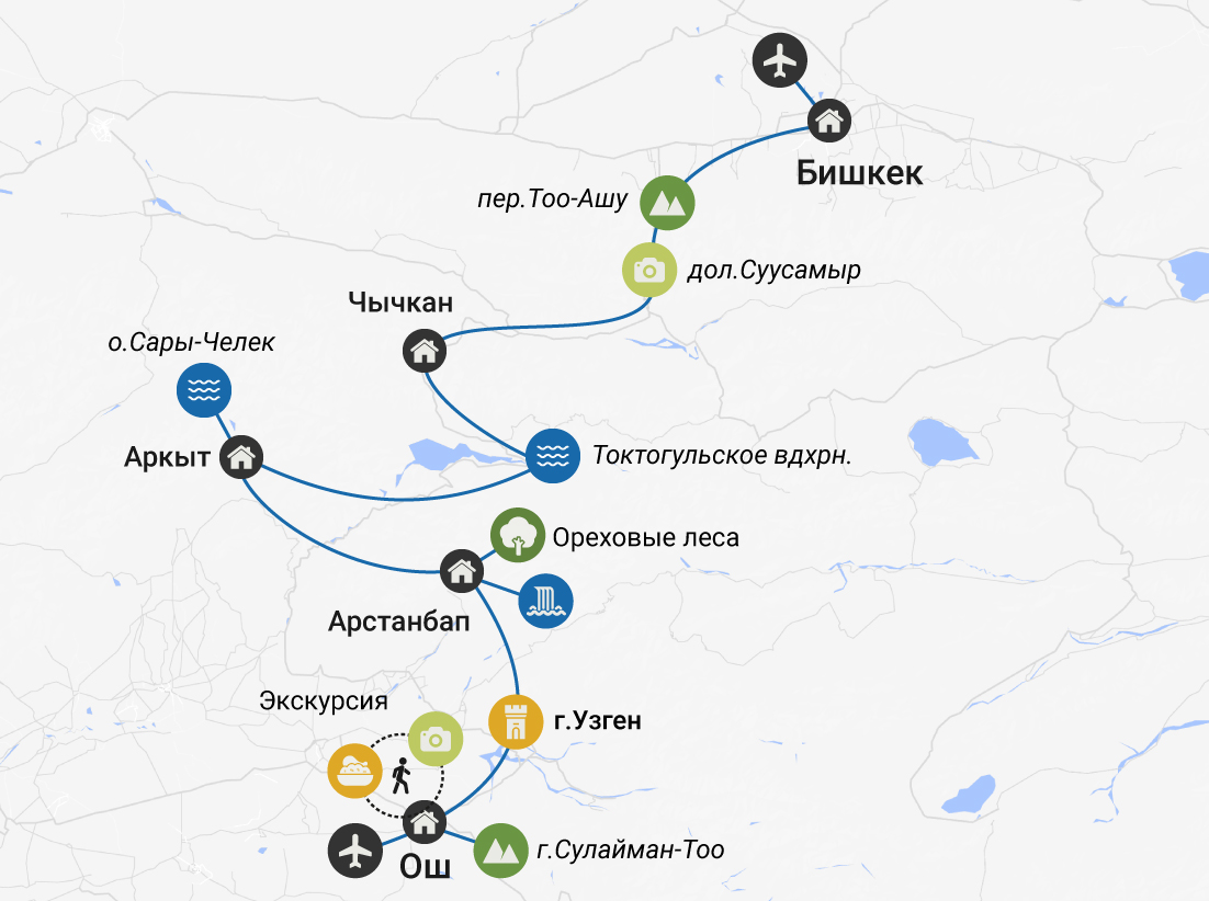 Наша дорога начнётся в Бишкеке. Отсюда мы отправимся на юг через перевалы и ущелья, вдоль рек и через небольшие поселения. Финальной точкой станет Ош, один из древнейших городов Центральной Азии.