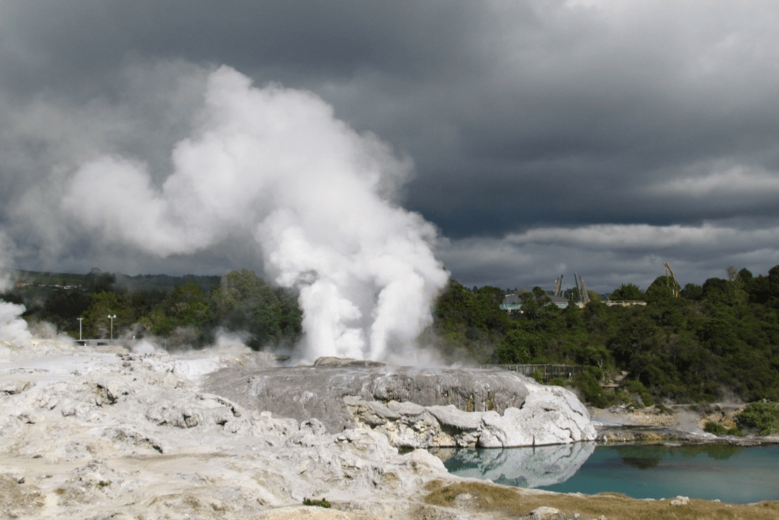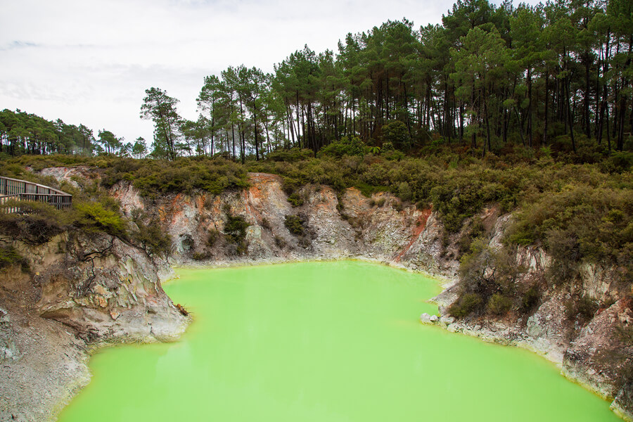 Этот день посвящён исследованию природных феноменов в окрестностях Роторуа. Сначала мы отправимся в геотермальный парк Вай-О-Тапу. Территория парка известна необычными формами и цветами: здесь находятся ярко-зелёное озеро «Купальня Дьявола» и Шампанское озеро, поверхность которого постоянно «кипит» из-за выходящих газов.