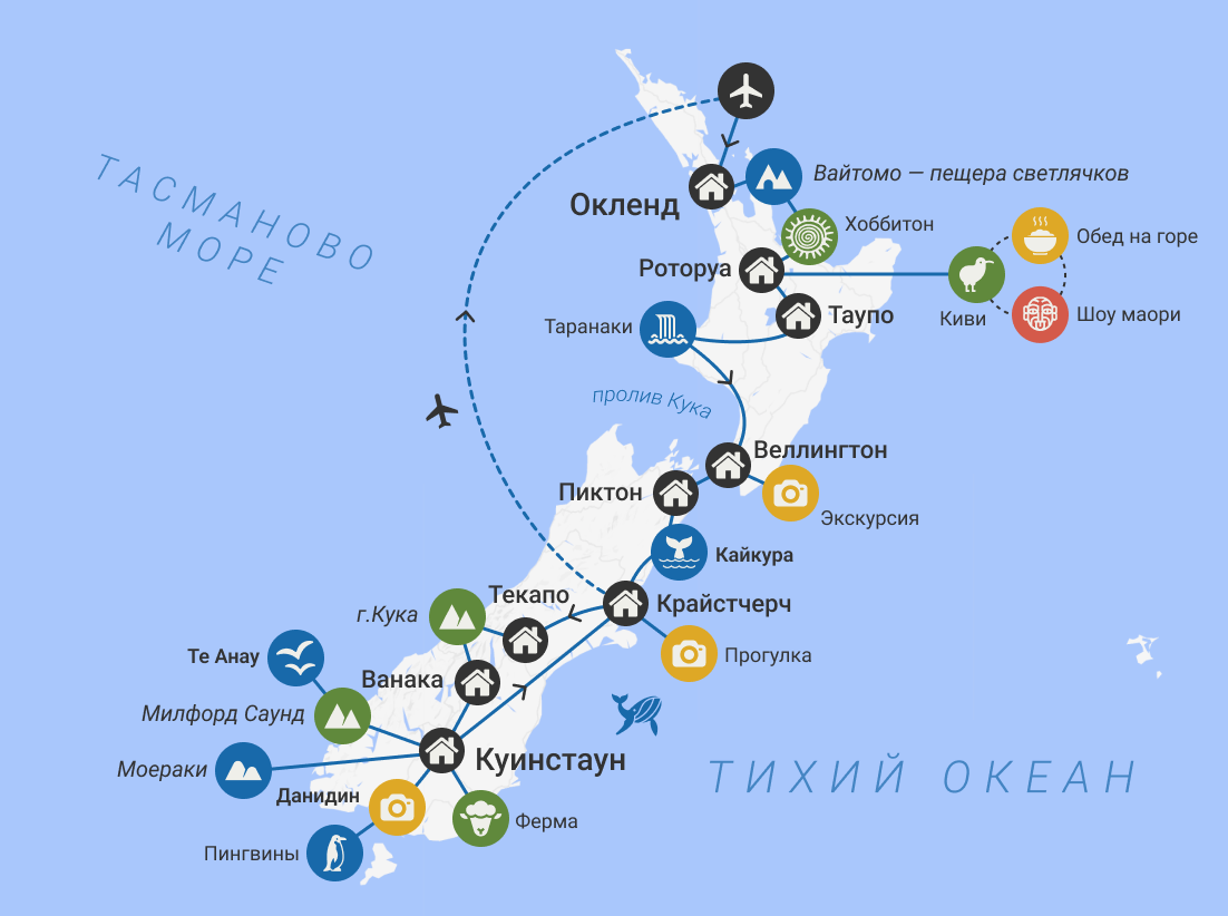 По завершении экскурсии из аэропорта Крайстчерча летим до Окленда, а потом — международный рейс домой.