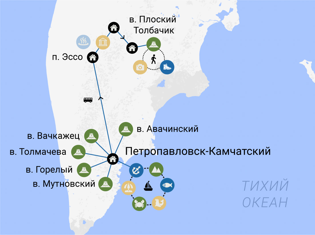 Важно! В программе тура не предусмотрено свободных дней для вертолётных экскурсий. Если вы хотите отправиться на вертолётную экскурсию, необходимо запланировать дополнительные дни на Камчатке.