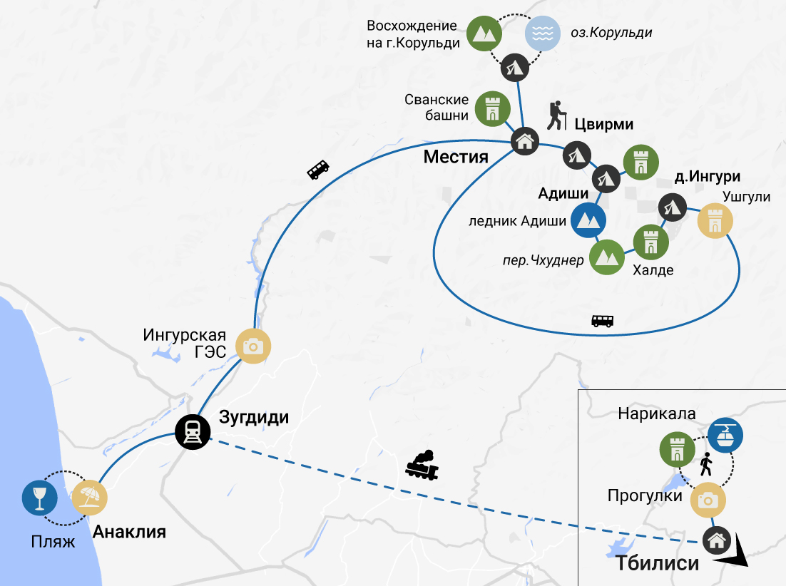 Культурная часть маршрута включает обзорные прогулки по Тбилиси, Местии и Ушгули, а ещё в завершающей части тура мы успеем отдохнуть на пляже Чёрного моря!