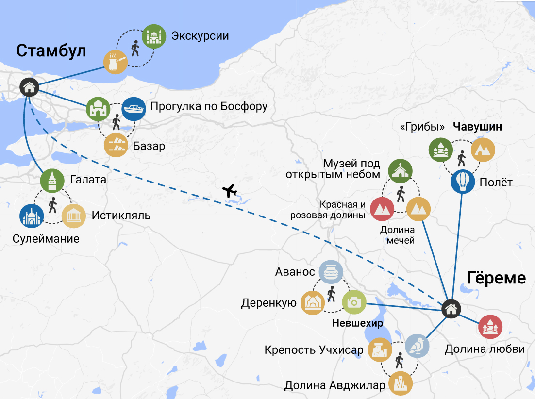 Внутренний перелёт из Гёреме в Стамбул в 6-й день осуществляется местным авиарейсом из Невшехира или Кайсери.