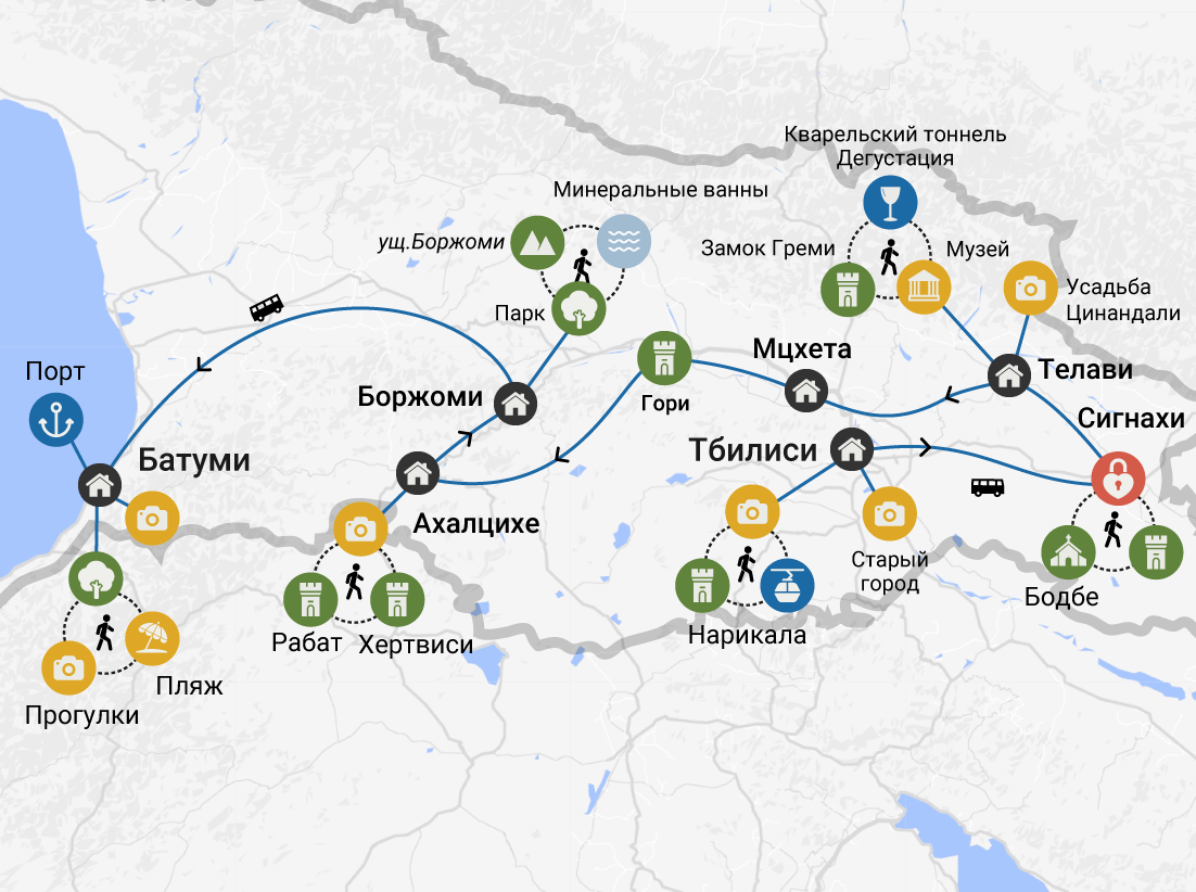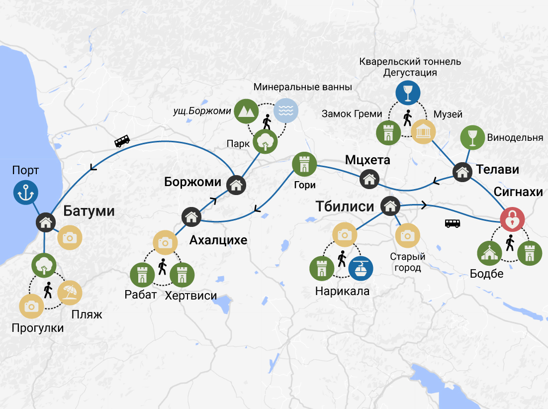 Нас ждёт увлекательное путешествие по нескольким регионам и городам: знаменитой своими винодельнями Кахетии, уютным улочкам Тбилиси, заповедному лесу Боржоми, старинным пещерам Вардзии и, конечно, роскошному Батуми со стеклянными небоскрёбами и поющими фонтанами. Соберём впечатлений на много лет вперёд!