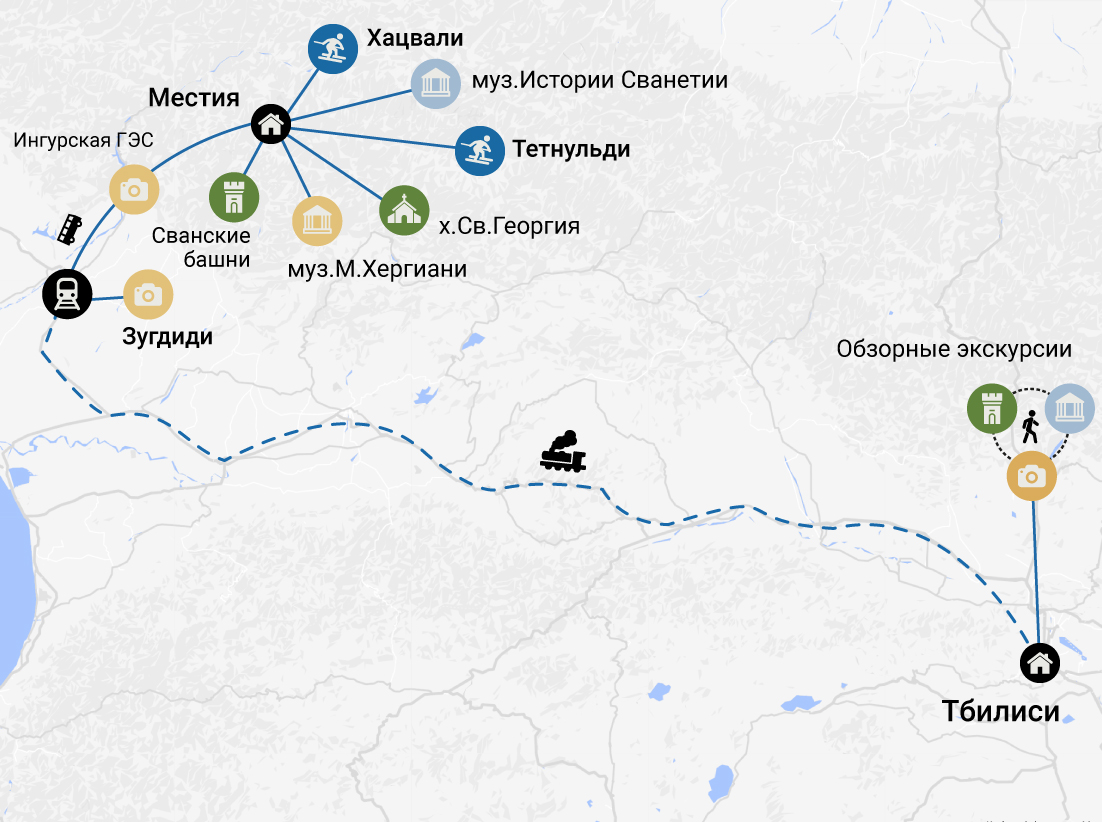 Будем жить в Местии – дивном городке, окружённом горными хребтами. Мы посетим два суперсовременных лыжных курорта – Тетнульди и Хацвали с трассами всех уровней сложности. Наши обеды будут проходить в ресторанах на вершинах гор, а ужины – в долине, в кафе с местным колоритом, музыкой и угощениями. Будем гулять по вечерней Местии, посетим музей истории Сванетии и средневековый дом, в котором родился знаменитый альпинист Михаил Хергиани.