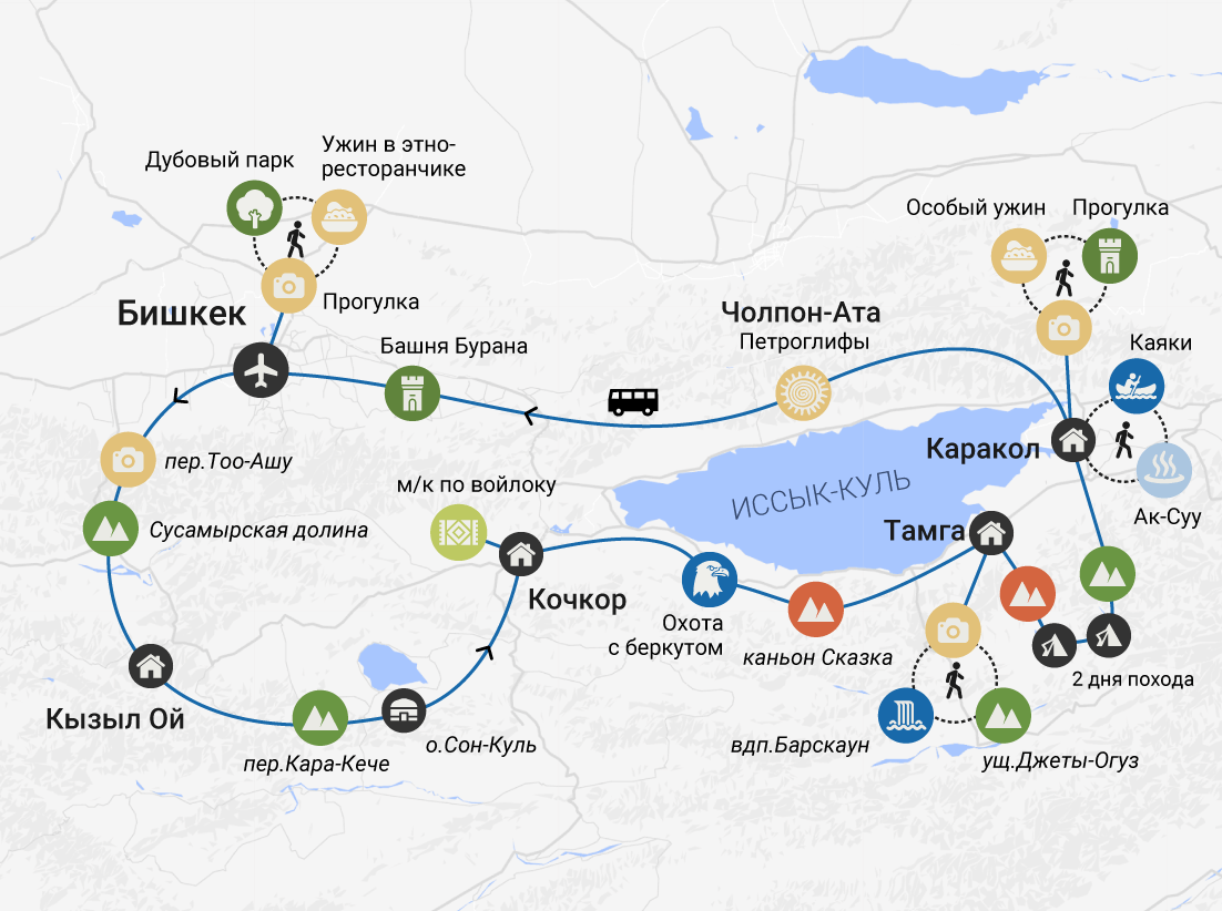 Внимание! Для тех, кто прибывает после 16:00, встреча состоится в 18:30. А обзорная экскурсия по Бишкеку пройдёт утром в последний день тура.