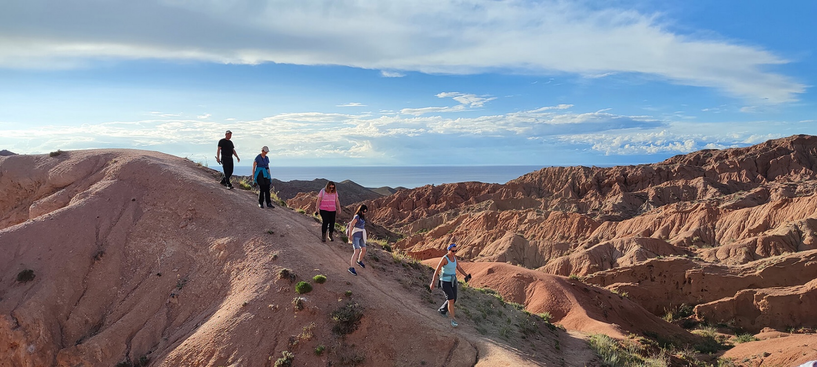 По каменистым склонам вдоль отвесных скал мы продолжим путь наверх. В конце перехода нас ждёт настоящий подарок — незабываемый вид на горное озеро Ала-Куль с чистейшей бирюзовой водой, в которой отражаются вершины окружающих хребтов.