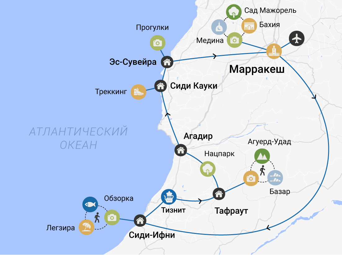 Сегодня начинается наше путешествие к далёким берегам Атлантики. Увидим горную цепь Высокого Атласа и пересечём её отроги, направляясь в южную сторону, к провинции Сиди-Ифни. Со времён правления Испании здесь остались бело-голубые здания, набережная в колониальном стиле и старый театр. А поселимся в традиционном марокканском доме с внутренним двориком — риаде.