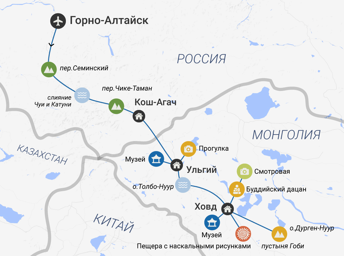 В первый день тура в 10:00 по местному времени в аэропорту Горно-Алтайска и на парковке отеля «Игман».