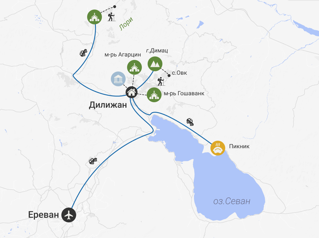 Во второй половине дня встречаемся с группой: можно присоединиться прямо в аэропорту Еревана или встретиться в городе (подробнее в разделе «Место и время встречи»). После знакомства нас ждёт переезд в Дилижан — дорога займёт около двух часов.