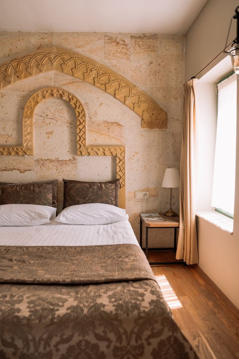 Стандартный вариант – это аутентичный отель пещерного типа. Стены номеров облицованы туфом. В номерах отеля, благодаря туфу, поддерживается благоприятная для организма влажность. В отделке номеров используются только натуральные материалы. Традиционная обстановка выглядит довольно скромно, но всё необходимое для проживания есть: отопление, удобные кровати, душ, фен, полотенца, телевизор. Холодильника и мини-бара нет. Чай можно пить в лобби в любое время.