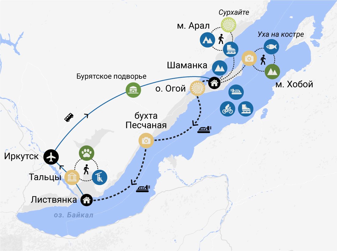 Утром попрощаемся в Ольхоном, затем сядем в «Хивус» и отправимся в сторону Листвянки по прозрачному льду. По пути будем делать остановки: сначала посетим остров Огой – это одно из мест силы Байкала, где находится буддийская Ступа Просветления, к которой мы обязательно прикоснёмся. Осмотрим мыс Саган-Заба, что в переводе с бурятского означает «белая скала», и исследуем древние петроглифы – наскальные рисунки, некоторым из них более 4 тысяч лет!