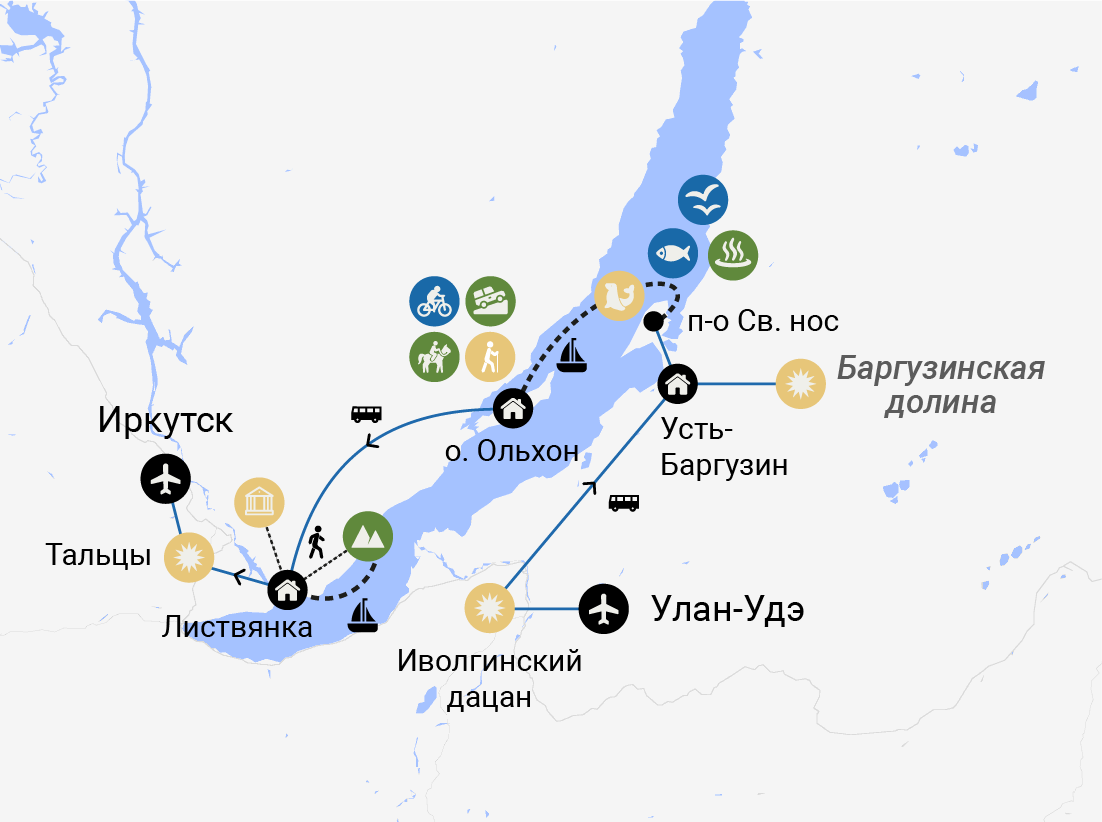2. Альтернативный вариант: с прибытием и обратным вылетом из Иркутска. Этот вариант иногда может быть дешевле, так как пункт прибытия и вылета одинаковый. В этом случае вам нужно будет сесть на ночной поезд Иркутск — Улан-Удэ, чтобы прибыть к месту старта. Поезд из Иркутска прибывает в Улан-Удэ около 6 утра. Необходимо будет дождаться трансфера, который заберёт вас с ж/д вокзала перед общей встречей группы около 8 утра.