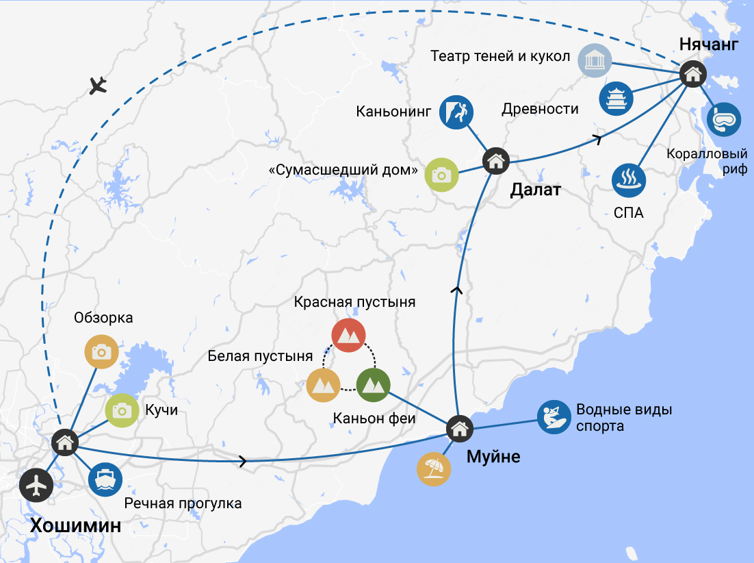 Отправляемся в путешествие по экзотической стране, день за днём открывая её новые стороны: нагуляемся по диковинным городам, попробуем себя в каньонинге, побываем в пустыне, понежимся на чистейшем пляже и отдохнём в СПА. Отдельное внимание уделим знакомству с историей Вьетнама и национальной кухней — уверены, некоторые блюда вас удивят!